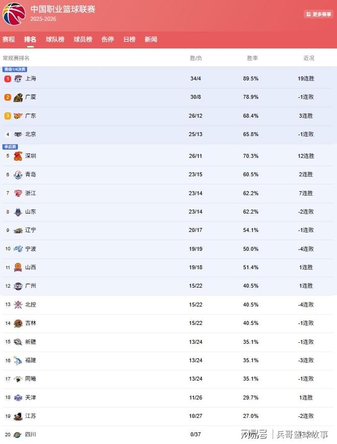 上海队拿下北京队后,豪取19连胜,球队战绩来到了34胜4负,领先广厦队4场胜负差,在与广厦胜负关系占优的情况下,哪怕上海后面4场全输,也能压制广厦排在第1位,球队提前4轮锁定联赛第1的位置!